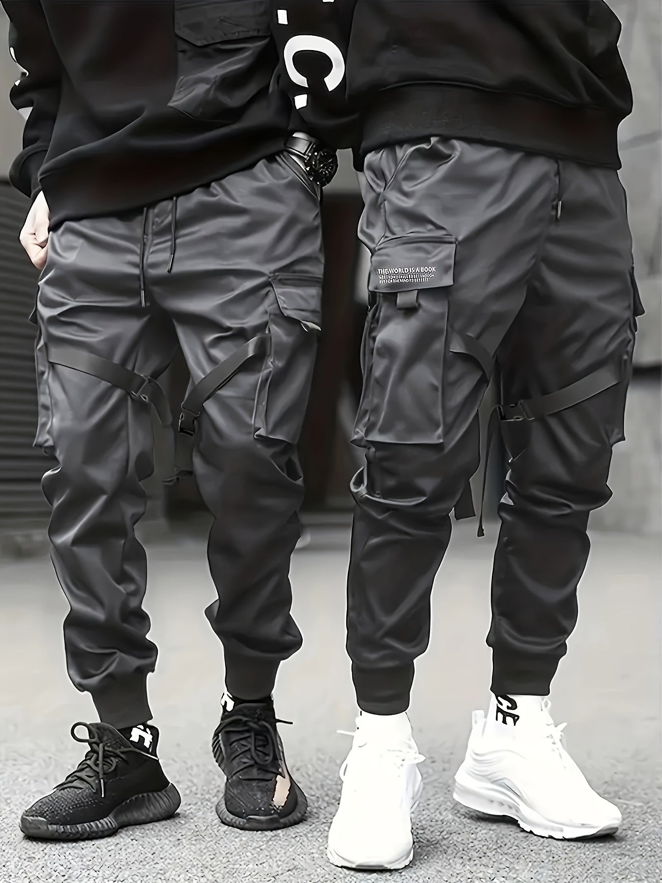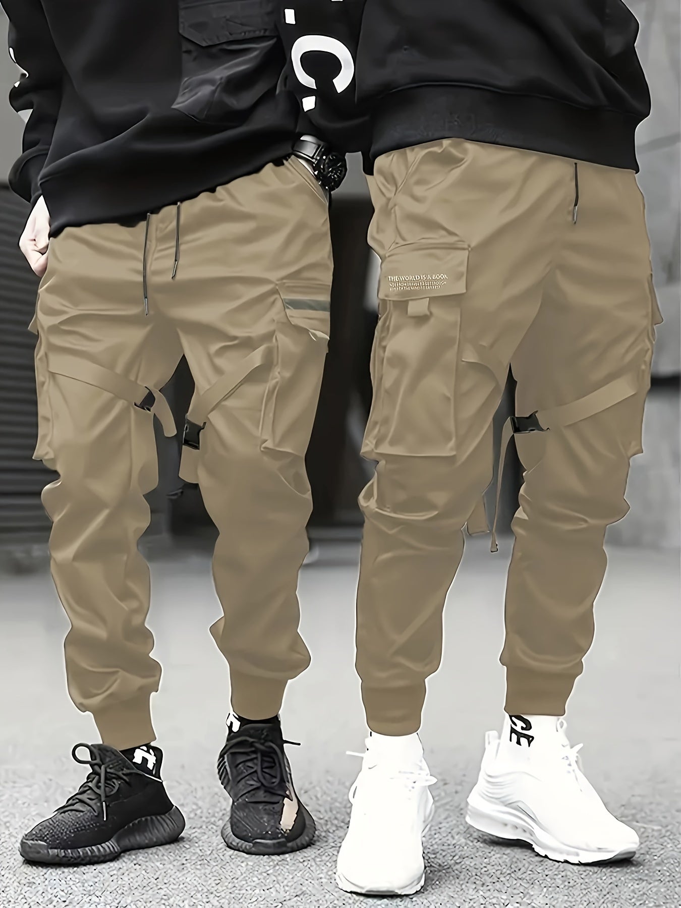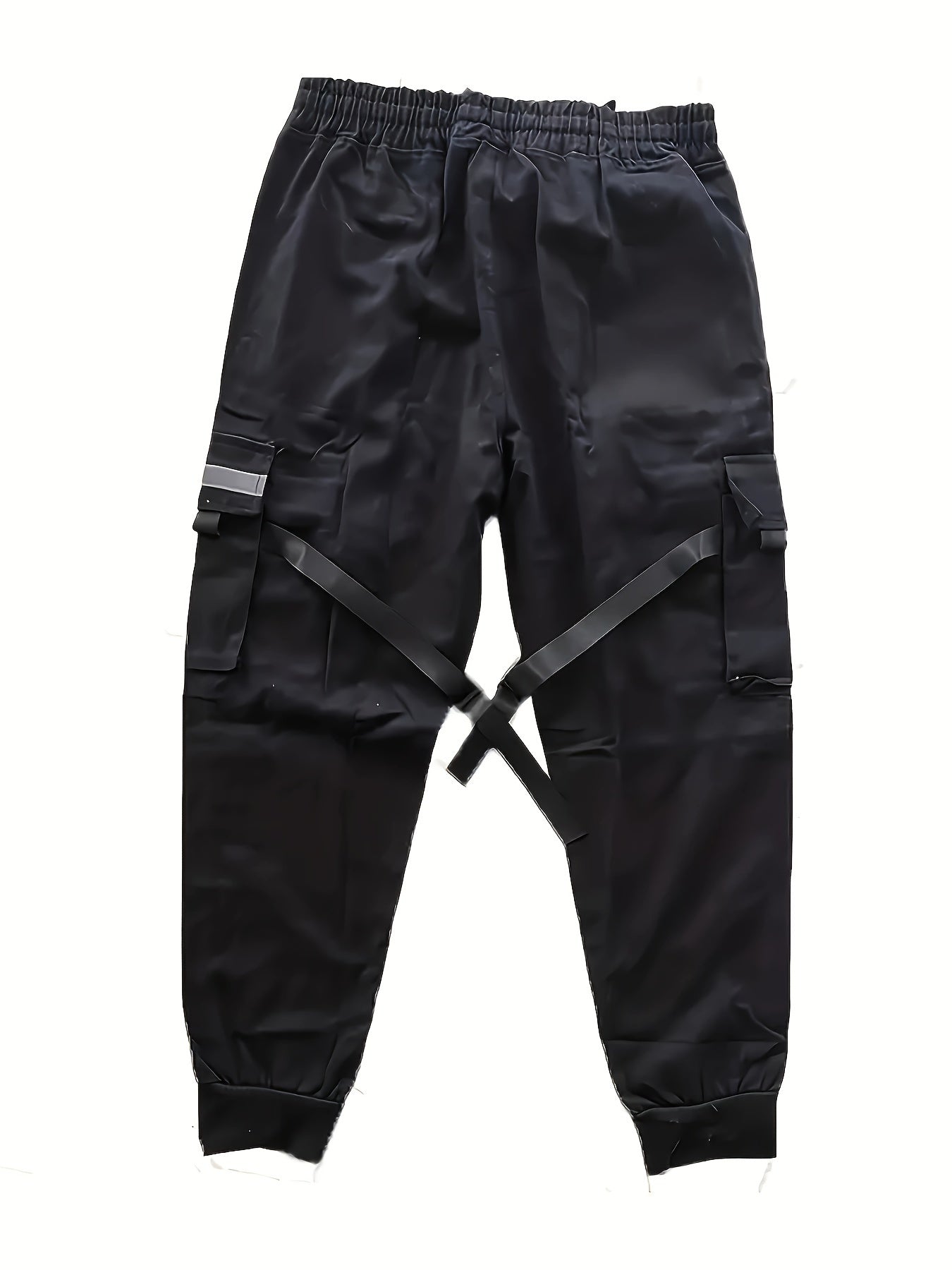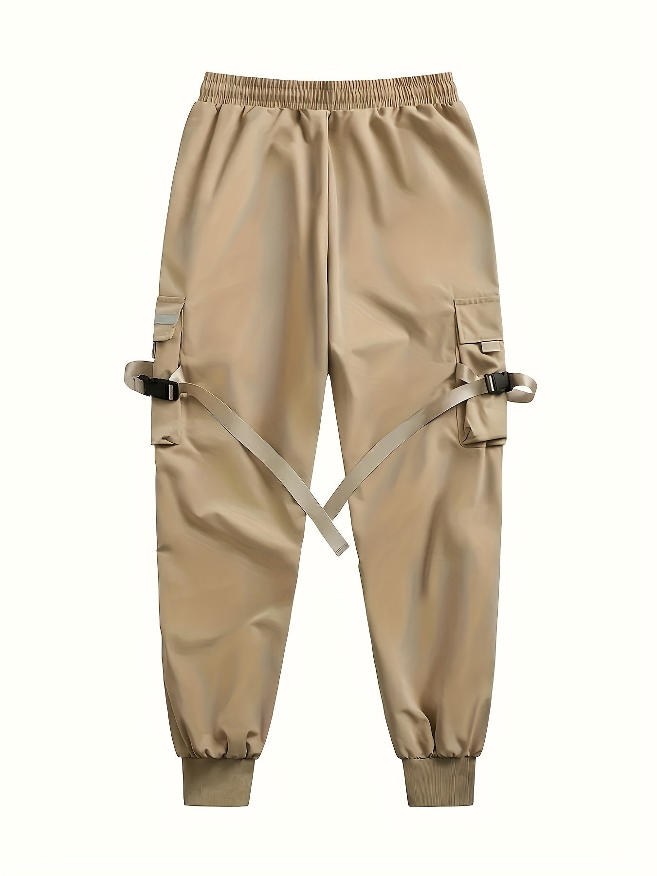 These cargo pants feature a structured, tapered fit with multiple pockets and strap details along the legs. The elastic cuffs create a clean, athletic shape, while the adjustable waistband provides a comfortable everyday fit. Visible stitching and layered sections give the pants a modern, practical look suitable for daily wear, casual outings, or relaxed outdoor moments.